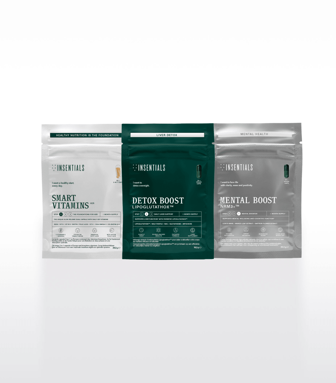 Le plan en 3 étapes d’Insentials soutient une santé durable : d’abord la base avec des micronutriments essentiels (Smart Vitamins), ensuite le soutien du foie et de la détoxification, et enfin l’accent sur votre objectif de santé personnel : la santé mentale.